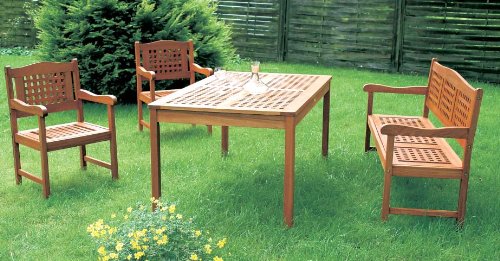 Gartengarnitur der Luxusklasse: Garnitur Lima aus massivem FSC - zeritifiziertem Eukalyptus Holz. Die 4-teilige Garnitur besteht aus: 1x Bank 3-sitzig, 2x Sessel, 1x Tisch 90x150 cm. Eukalyptus Holz braucht nicht mit einer Farbe oder Holzlasur nachgestrichen zu werden, nachlen mit einem Pflegel gengt. Eine detaillierte Anleitung mit Pflegetipps ist im Lieferumfang enthalten. Mae Tisch: * Lnge 150cm * Breite 90cm * Hhe 73cm * Gewicht 26kg Mae Sessel: * Breite 60cm * Tiefe 64cm * Hhe 87cm * Rckenhhe 48 * Sitzhhe 41 * Sitzbreite 50 * Sitztiefe 45 Mae 3-sitzer Bank: * Breite 160cm * Tiefe 64cm * Hhe 87cm * Sitzbreite150cm * Sitztiefe 45cm * Sitzhhe 41cm * Rckenhhe 48cm