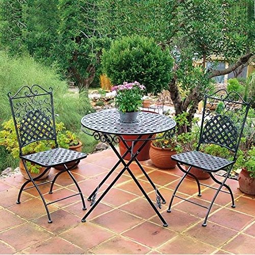 Mit diesen filigran gearbeiteten Sthlen und dem stilechten Tisch macht das Kaffeetrinken richtig Laune ? ein echt orientalischer Traum. Die Mitte des Tisches ziert eine przise und sehr fein gearbeitete Rosette. Aus Schmiedeeisen, silber/anthrazit patiniert. Alles platzsparend und leicht zusammenklappbar. Die Sitzgruppe besteht aus:2 Sthle: Je Hhe 95 cm, Tiefe 47 cm, Breite 42 cmTisch: Hhe 74 cm, Durchmesser 70 cm Besserer Schutz gegen Rost durch Pulverbeschichtung!Fr eine hhere Witterungsbestndigkeit wurde dieser Eisenartikel gereinigt, vorbehandelt und 2 x mit elektrostatischem Pulverlack berzogen.